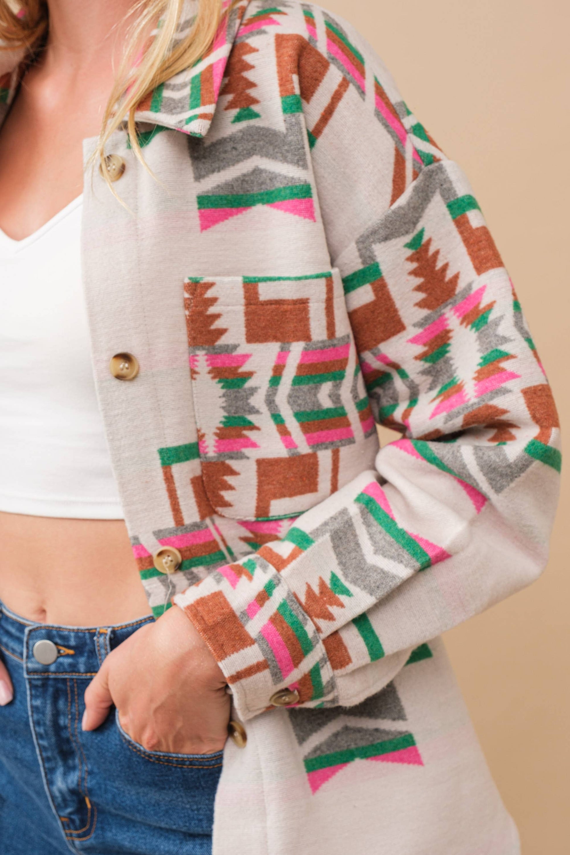 34201J - Blue B Exclusive Aztec Pattern Button Up Jacket: FUCHSIA GREEN / S