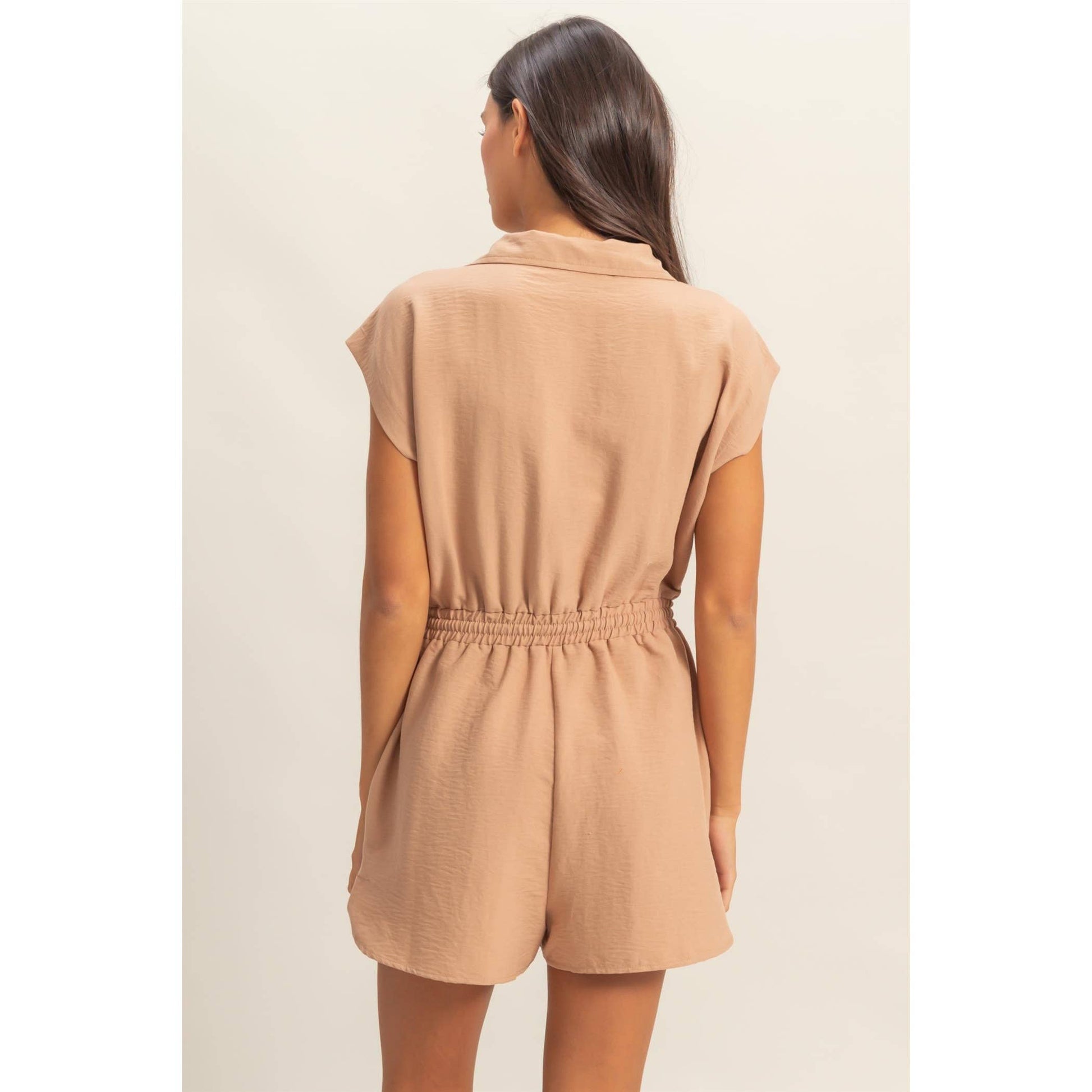 Collared Romper with Buttonless Placket:DARK TAUPE