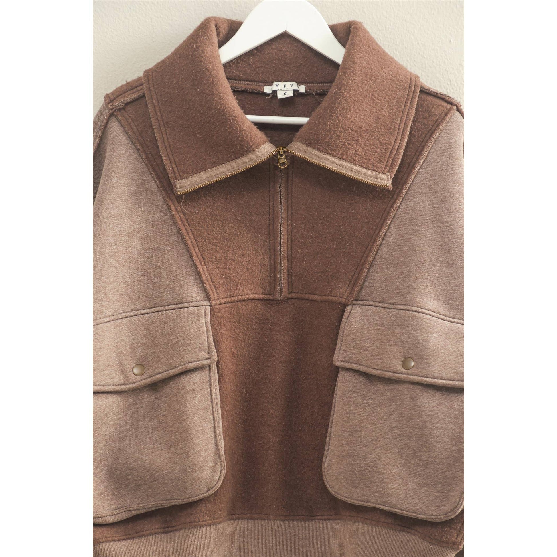 Embrace the trendy and cozy feel of this oversized sweatfleece top, featuring a soft texture perfect for chilly days. The half-zip closure adds a casual yet stylish touch, while the large front pocket is practical for essentials. Ideal for pairing with skinny jeans or leggings, this top offers versatile styling options and is perfect for layering with a lightweight turtleneck and statement accessories. 65% Polyester 35% Cotton Model Is 5' 8" Tall, 32" Chest, 23" Waist, 34" Hips And Wearing A Size Small