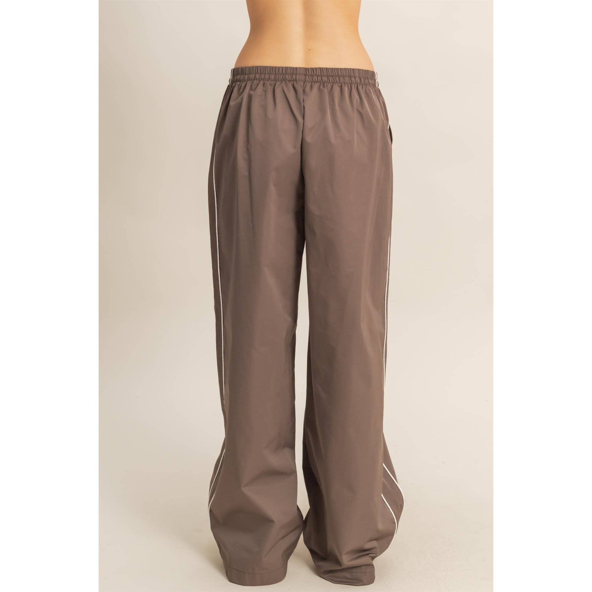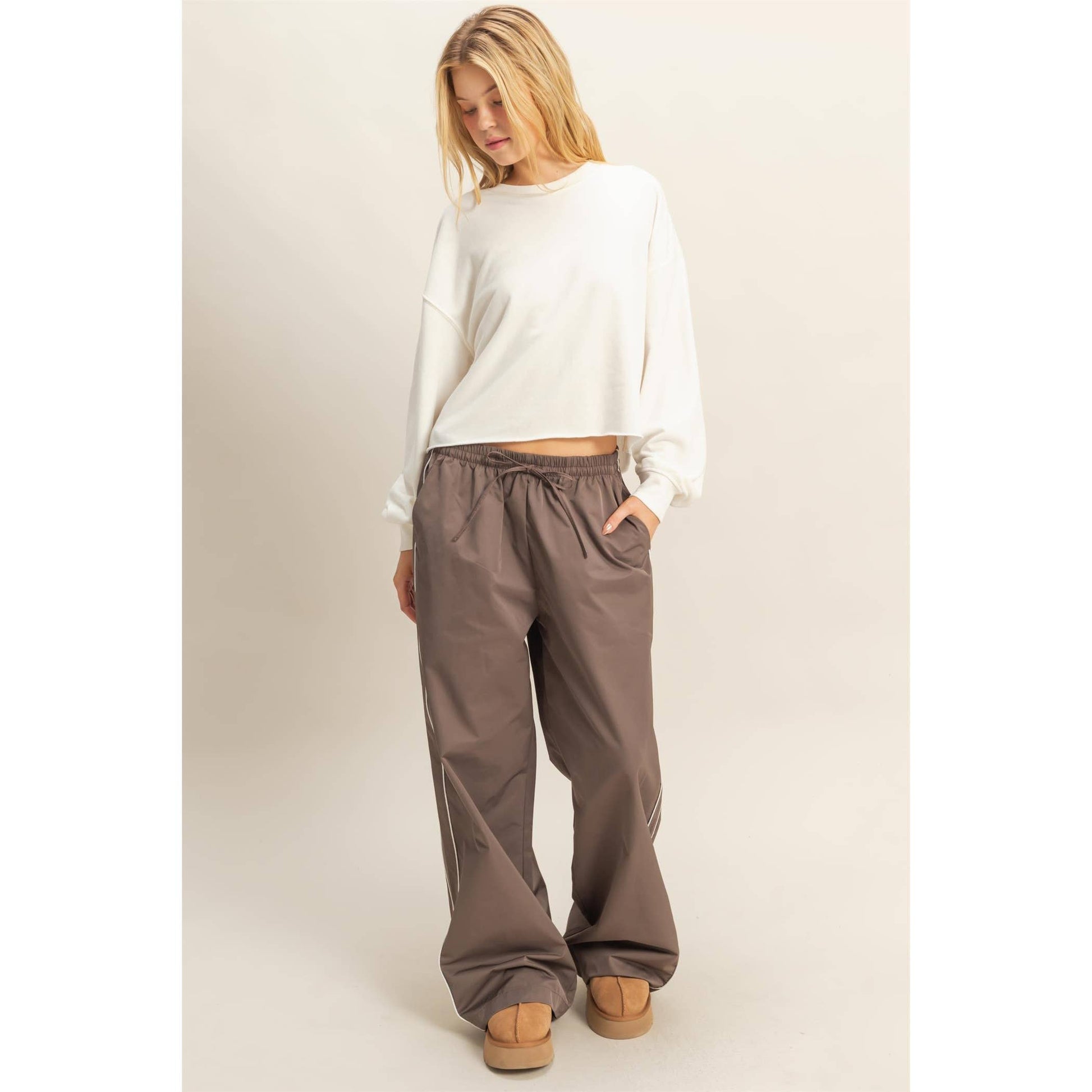 Experience The Epitome Of Chic Comfort With These Wide-Leg Pants, Boasting A Fluid Silhouette That Exudes Elegance. Designed To Flatter, These Pants Feature A Comfortable Elastic Waistband And Adjustable Drawstring To Ensure A Perfect Fit. The Standout Feature Is The Eye-Catching Contrast Piping Along The Seams, Which Adds A Sophisticated Touch. 100% Polyester Model Is 5' 7" Wearing A Small